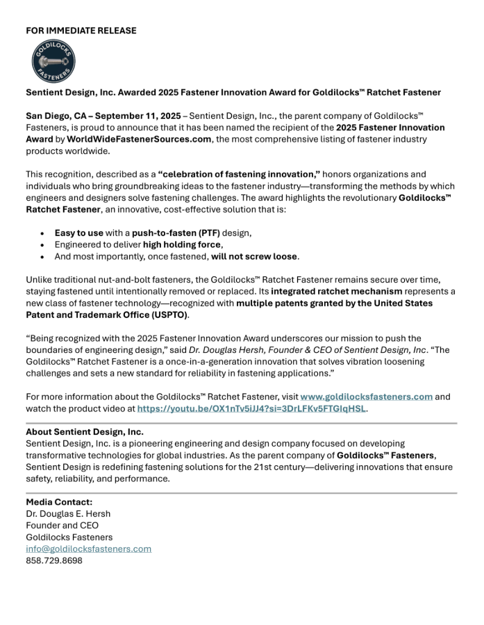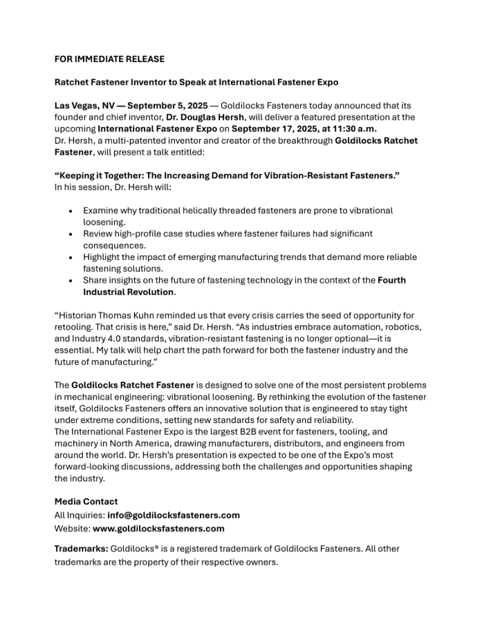 The Goldilocks™ fastener is an innovative, cost-effective solution that is easy to use and, once fastened, will not screw loose. It is a high holding force “push-to-fasten” (PTF) device that you can rely on forever.